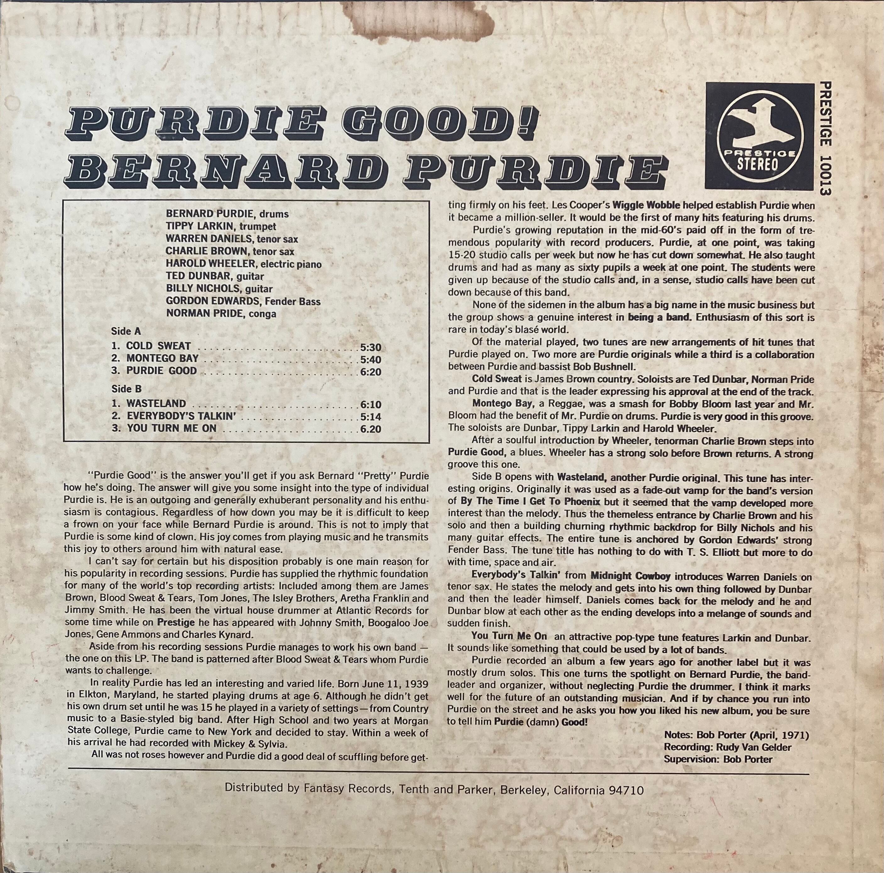 アレサ・フランクリンからスティーリー・ダンまで数々の名盤に彼のクレジットが載る名ドラマー"バーナード・パーディ"が伝説のエンジニア"のルディ・ヴァンゲルダー・スタジオで録音した彼のリーダー・アルバム71年。